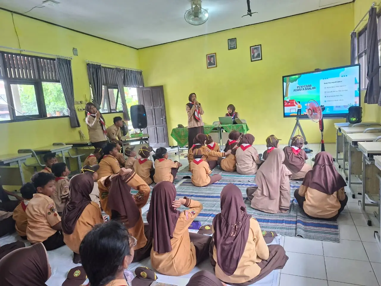Identifikasi Dampak, Siswa diajak memahami bahwa banjir bukan sekadar air yang menggenang, melainkan membawa risiko penyakit kulit, diare, rusaknya fasilitas sekolah, hingga terganggunya proses belajar mengajar.