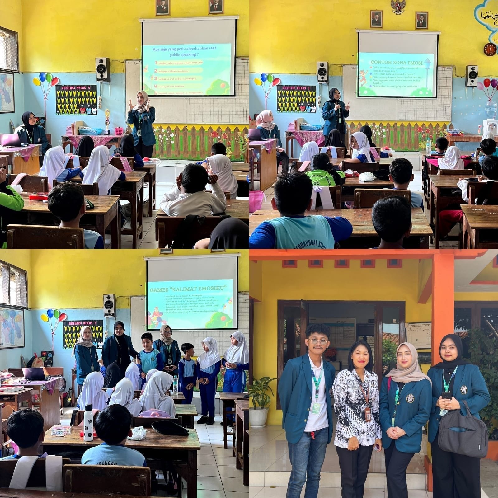 Setelah itu, siswa diajak untuk mengikuti dua permainan utama yaitu: Kalimat Emosiku dan Emosi Berantai. Dalam Kalimat Emosiku, tiap kelompok memilih satu anggota untuk menyampaikan kalimat berisi perasaan mereka. Teman-teman lainnya menebak zona emosi yang dimaksud sembari mengacungkan kartu zona emosi yang sesuai. Hal ini membuat suasana kelas menjadi hidup, penuh gelak tawa dan anak semangat berani mencoba.
