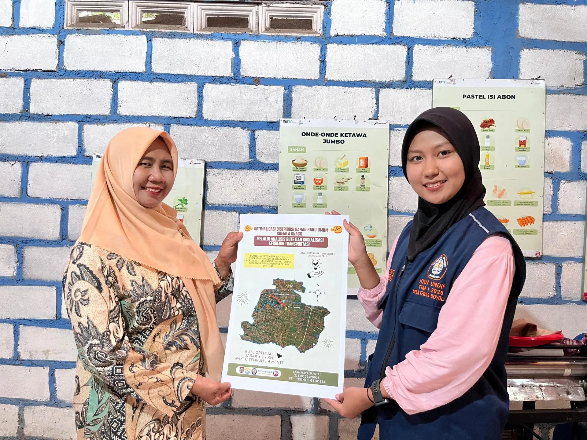 JATENGKU.COM, Boyolali – Mahasiswa Kuliah Kerja Nyata Tematik (KKN-T) Universitas Diponegoro melaksanakan program kerja optimalisasi distribusi bahan baku pada UMKM Kumala Snack yang berlokasi di Kabupaten Boyolali pada Jumat (23/01/2026). Program ini bertujuan untuk membantu pelaku UMKM dalam meningkatkan efisiensi waktu dan biaya distribusi bahan baku melalui pemetaan lokasi pemasok serta analisis rute distribusi berbasis peta digital.