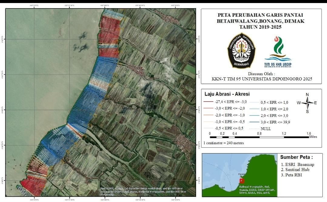 Selain itu, Mahasiswa KKN Tim 95 juga membuat peta visualisasi terkait abrasi yang ada diperairan Betahwalang. Peta ini menyajikan analisis perubahan garis pantai di wilayah Betahwalang, Kecamatan Bonang, Kabupaten Demak, dalam kurun waktu 2019 hingga 2025. Analisis ini dilakukan oleh KKN-T Tim 95 Universitas Diponegoro 2025, bekerja sama dengan TIM 95 KKN UNDIP.