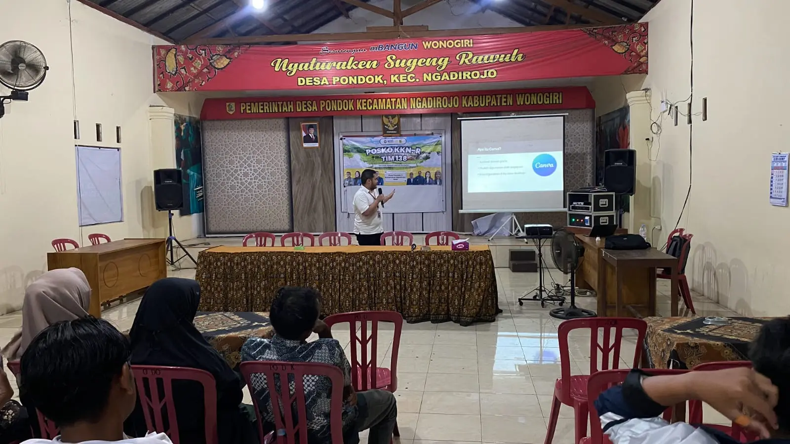 JATENGKU.COM, Wonogiri — Dalam rangka mendukung peningkatan literasi digital masyarakat serta penguatan kapasitas pelaku Usaha Mikro, Kecil, dan Menengah (UMKM), mahasiswa Kuliah Kerja Nyata (KKN) Universitas Diponegoro melaksanakan kegiatan sosialisasi mengenai pemanfaatan aplikasi desain grafis Canva sebagai media promosi produk. Kegiatan ini dilaksanakan oleh Ahmad Muhajir, mahasiswa Fakultas Sains dan Matematika, Jurusan Informatika, Universitas Diponegoro, sebagai bentuk implementasi pengabdian kepada masyarakat melalui penerapan ilmu pengetahuan dan teknologi yang relevan dengan kebutuhan desa.