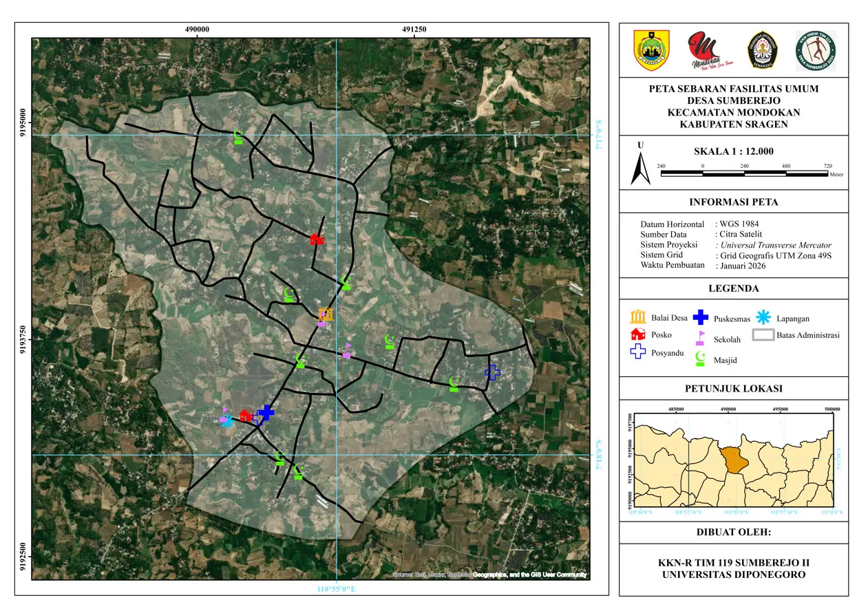 Pemetaan dilaksanakan pada salah satu dusun di Desa Sumberejo yang terdiri dari lima dukuh. Dalam kegiatan tersebut, mahasiswa melakukan survei lapangan secara langsung untuk mengidentifikasi dan mencatat lokasi berbagai fasilitas umum yang ada di wilayah tersebut. Fasilitas yang dipetakan meliputi balai desa, posyandu, fasilitas kesehatan, fasilitas pendidikan, masjid, serta sarana olahraga.