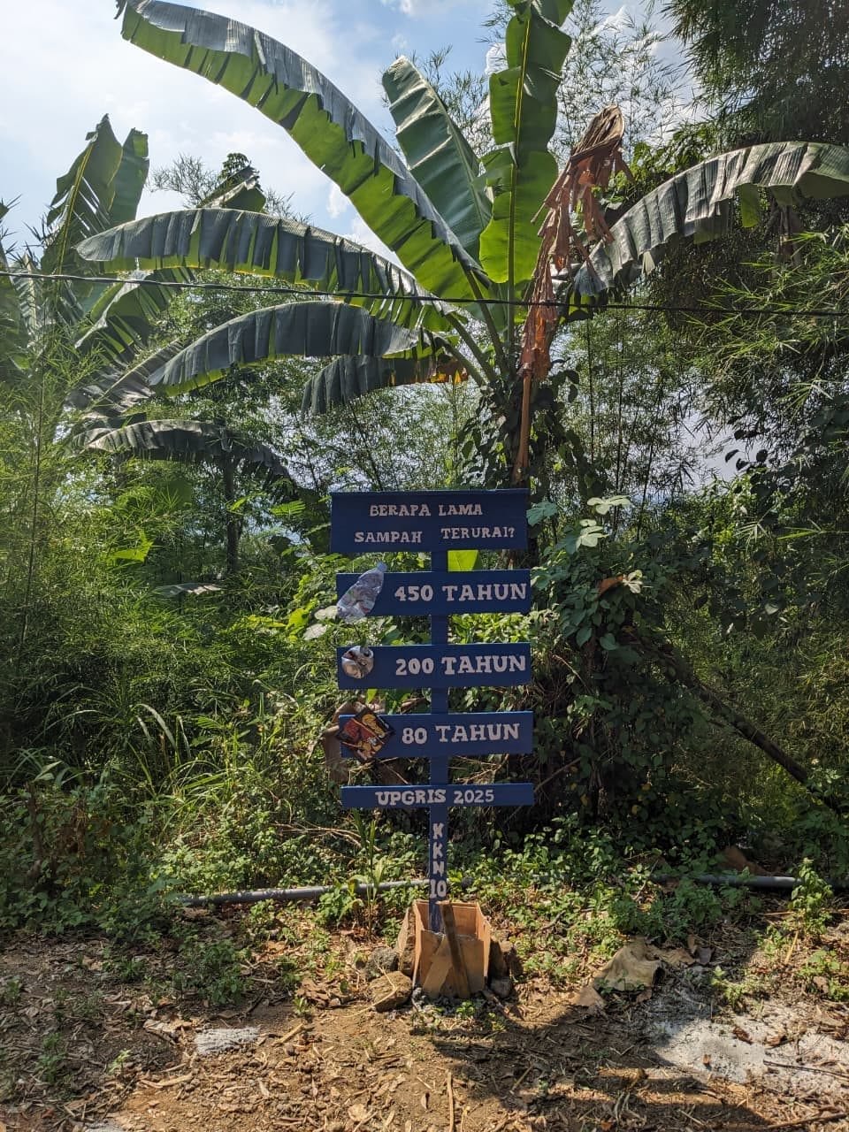 Selain infrastruktur penerangan, kelompok mahasiswa ini juga fokus pada isu lingkungan yang krusial, yaitu pengelolaan sampah. Mereka membangun Papan Informasi Edukasi Pengelolaan Sampah (Plang Sampah) yang diletakkan di lokasi strategis.