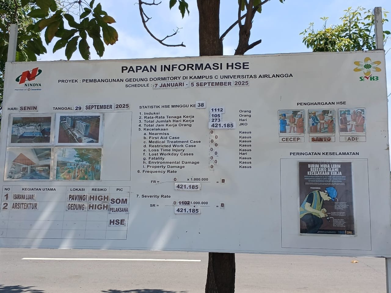 Salah satu hal menarik dari proyek Asrama Unair adalah adanya penghargaan bagi pekerja yang mematuhi prosedur keselamatan. Nama-nama seperti CECEP, SANTO, dan ADI terpampang di papan HSE sebagai bentuk apresiasi. Langkah sederhana ini memiliki efek besar.