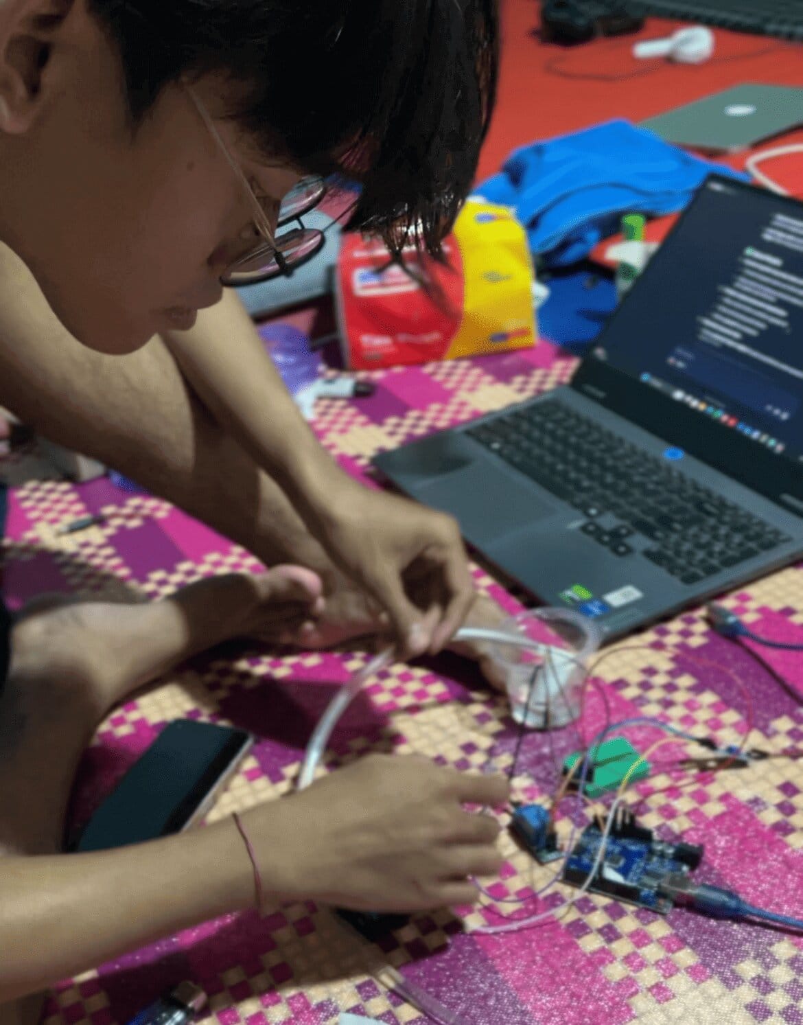 CAPTION: “Presisi di Balik Inovasi.” Anggota tim KKN Desa Pretek sedang melakukan proses coding dan perakitan sistem penyiram tanaman otomatis. Memastikan setiap baris kode dan sambungan kabel pada Arduino Uno bekerja sempurna sebelum diaplikasikan untuk membantu produktivitas Kelompok Wanita Tani (KWT) Desa Pretek.